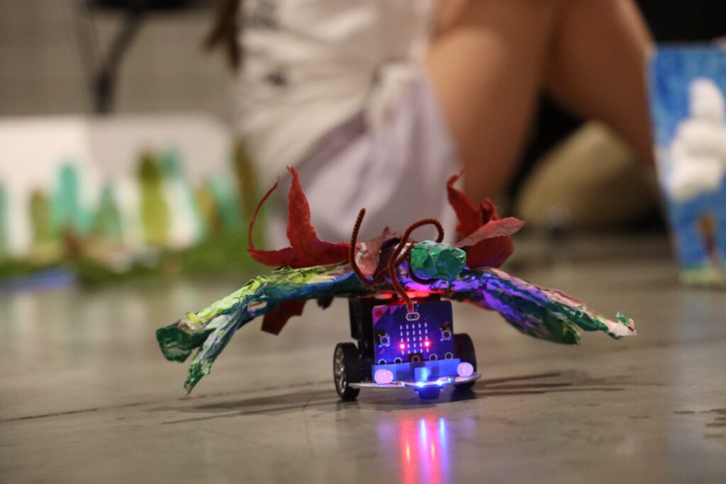 Long said these second graders were introduced to programming before this project, so they used their coding skills on a robot car kit to make it move. At the final step, Long attached the art projects to the student-programmed robots and their insects took flight.